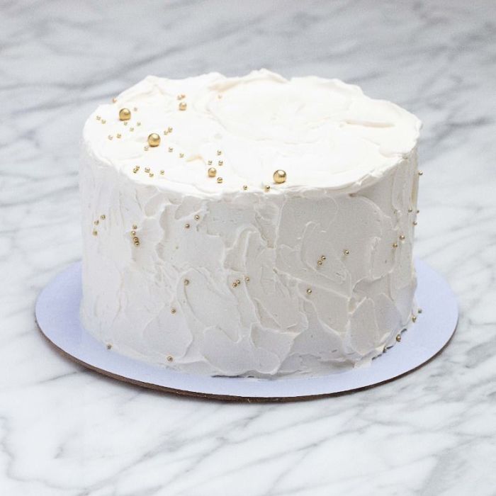 Topped with delicate gold sprinkles for a touch of sparkle, this cake is perfect for weddings, birthdays, and elegant celebrations.
